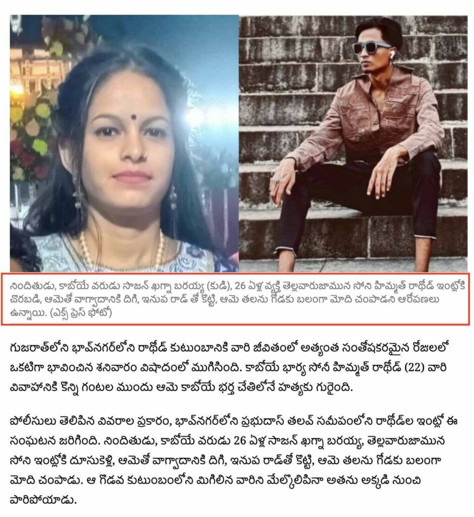 చివరగా, 14 నవంబర్ 2025న గుజరాత్లోని భావ్నగర్లో వివాహ వేడుకకు కొన్ని గంటల ముందు వధువు సోనీ హిమ్మత్ రాథోడ్ను హత్య చేసిన వరుడు సాజన్ ఖన్నాబాయి బరేయా ముస్లిం కాదు.