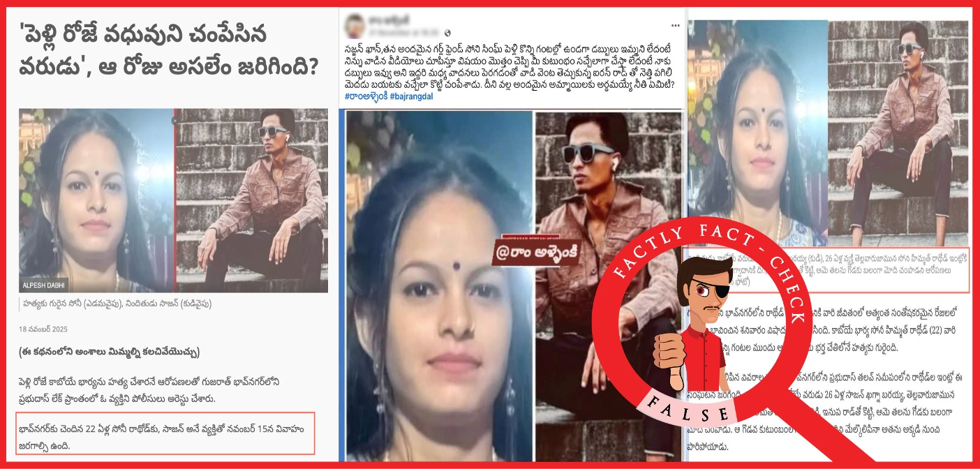 ఫాక్ట్(నిజం): 14 నవంబర్ 2025న గుజరాత్లోని భావ్నగర్లో వివాహ వేడుకకు కొన్ని గంటల ముందు వధువు సోనీ హిమ్మత్ రాథోడ్ను హత్య చేసిన వరుడు సాజన్ ఖన్నాబాయి బరేయా ముస్లిం కాదు, అతను హిందువు. సాజన్ ఖన్నాబాయ్ బరేయా హిందువు అని కేసు దర్యాప్తు చేస్తున్న గంగాజలియా పోలీస్ స్టేషన్ SHO మాకు (Factly) తెలిపారు. కావున పోస్టు ద్వారా చెప్పేది తప్పు.