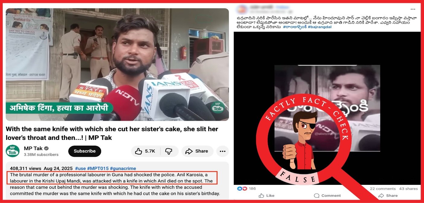 చివరగా, ఆగస్టు 2025లో మధ్యప్రదేశ్లోని గుణ జిల్లాలో జరిగిన అనిల్ కరోసియా హత్యను తప్పుడు మతపరమైన కథనంతో షేర్ చేస్తున్నారు.