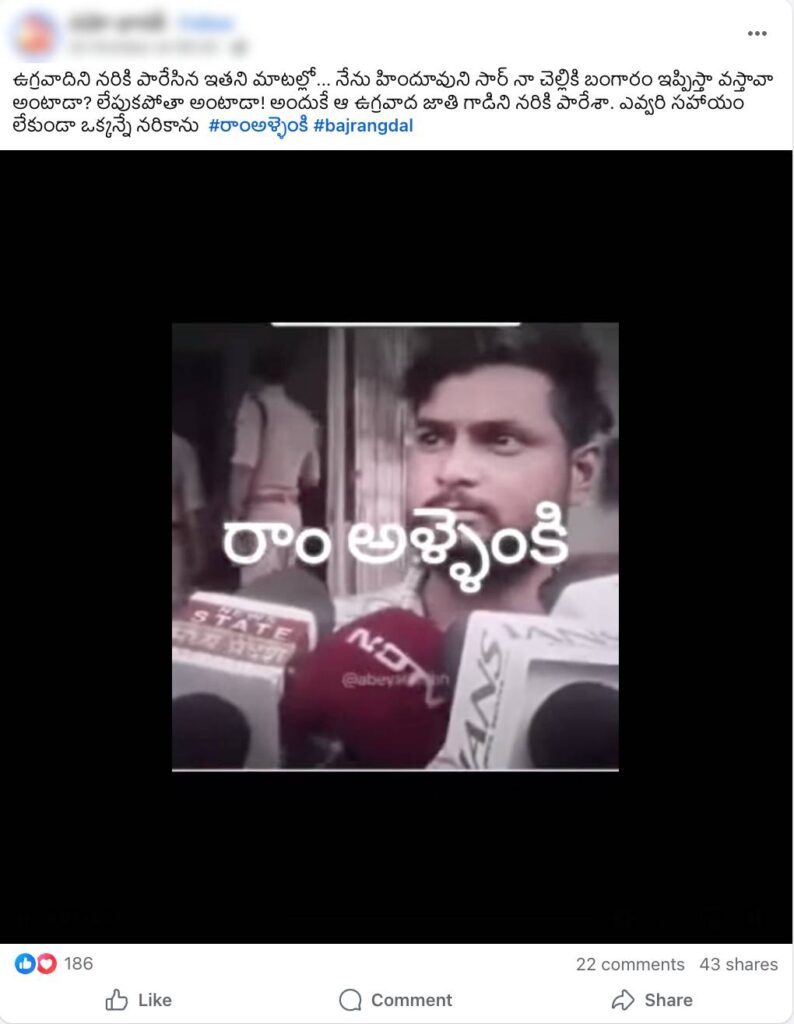 తన సోదరిని వేధిస్తున్న ముస్లిం వ్యక్తిని ఓ హిందువు హత్య చేశాడంటూ ఓ వీడియో సోషల్ మీడియాలో వైరల్ అవుతోంది (ఇక్కడ, ఇక్కడ, ఇక్కడ, & ఇక్కడ). ఈ వీడియోలో, తన సోదరిని వేధిస్తున్న వ్యక్తిని తానే చంపానని ఒక వ్యక్తి చెప్పడం మనం చూడవచ్చు. “ఉగ్రవాదిని నరికి పారేసిన ఇతని మాటల్లో… నేను హిందూవుని సార్ నా చెల్లికి బంగారం ఇప్పిస్తా వస్తావా అంటాడా? లేపుకపోతా అంటాడా! అందుకే ఆ ఉగ్రవాద జాతి గాడిని నరికి పారేశా. ఎవ్వరి సహాయం లేకుండా ఒక్కన్నే నరికాను” అని చెప్తూ ఈ వీడియోను షేర్ చేస్తున్నారు. ఈ కథనం ద్వారా అందులో ఎంత నిజముందో చూద్దాం.