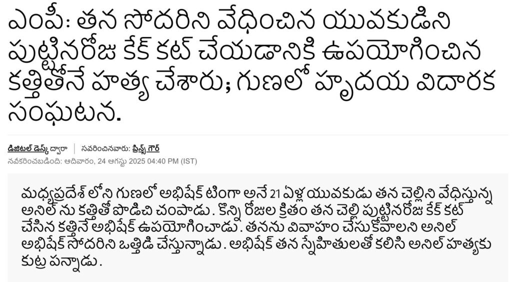 దీని ఆధారంగా ఈ ఘటనకు సంబంధించిన మరింత సమాచారం కోసం తగిన కీవర్డ్స్ ఉపయోగిస్తూ ఇంటర్నెట్లో వెతకగా, ఈ ఘటనకు సంబంధించిన పలు వార్త కథనాలు (ఇక్కడ, ఇక్కడ, ఇక్కడ, ఇక్కడ, & ఇక్కడ) మాకు లభించాయి. ఈ కథనాల ప్రకారం, 22 ఆగస్టు 2025న మధ్యప్రదేశ్లోని గుణ జిల్లాలో తన సోదరిని వేధిస్తున్నాడని అనే కారణంతో అభిషేక్ టింగా అనే వ్యక్తి తన స్నేహితులతో కలిసి అనిల్ కరోసియా అనే వ్యక్తిని కత్తితో పొడిచి చంపాడు.