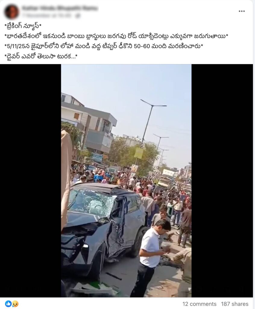 03 నవంబర్ 2025న, రాజస్థాన్ రాజధాని జైపూర్లోని లోహమండి ప్రాంతంలో ఘోర రోడ్డు ప్రమాదం చోటుచేసుకుంది. ఈ ఘటనలో కనీసం 10 మంది మృతి చెందగా, 50 మందికి పైగా గాయపడ్డారు (ఇక్కడ, ఇక్కడ, & ఇక్కడ). ఈ నేపథ్యంలో, “భారతదేశంలో ఇకనుండి బాంబు బ్లాస్టులు జరగవు రోడ్ యాక్సిడెంట్లు ఎక్కువగా జరుగుతాయి, 5/11/25న జైపూర్లోని లోహా మండి వద్ద టిప్పర్ ఢీకొని 50-60 మంది మరణించారు, డ్రైవర్ ఎవరో తెలుసా టురక” అంటూ ఓ ఘోర రోడ్డు ప్రమాదానికి సంబంధిచిన దృశ్యాలను చూపిస్తున్న వీడియో ఒకటి సోషల్ మీడియాలో వైరల్ అవుతోంది. ఈ వీడియోను షేర్ చేస్తూ ఈ రోడ్డు ప్రమాదానికి కారణమైన ట్రక్ డ్రైవర్ ముస్లిం అని క్లెయిమ్ చేస్తున్నారు. ఈ కథనం ద్వారా అందులో ఎంత నిజముందో చూద్దాం.