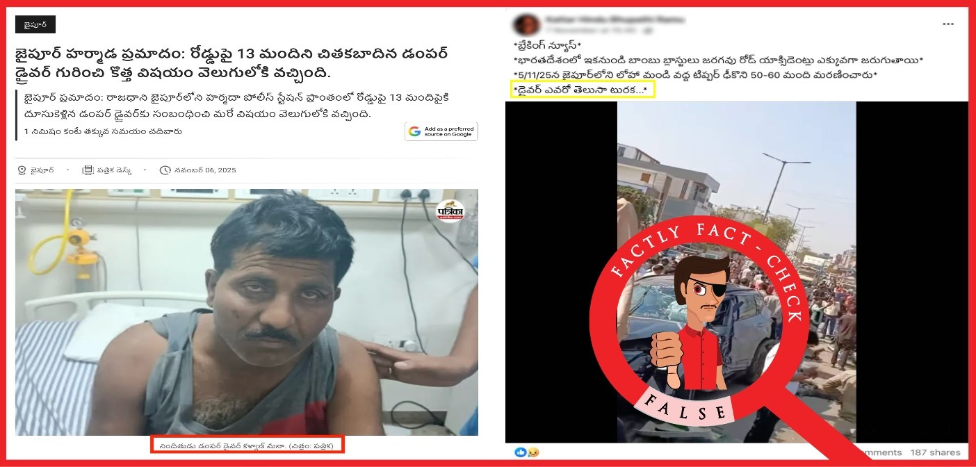 క్లెయిమ్: 03 నవంబర్ 2025న జైపూర్లోని లోహమండి ప్రాంతంలో జరిగిన ఘోర రోడ్డు ప్రమాదానికి కారణమైన ట్రక్కు డ్రైవర్ ముస్లిం.