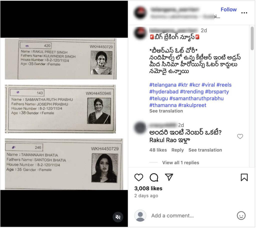 ఫాక్ట్(నిజం): వైరల్ అవుతున్న ఈ ఓటర్ల జాబితా ఫేక్. 2025 జూబ్లీహిల్స్ ఉప ఎన్నిక ఓటర్ల జాబితాలో సినీ హీరోయిన్లు తమన్నా, సమంత, రకుల్ ప్రీత్ సింగ్ ఓటర్లుగా నమోదు చేయబడలేదు. ఈ నకిలీ జాబితా వైరల్ కావడంతో జూబ్లీహిల్స్ నియోజకవర్గ అసిస్టెంట్ ఎలక్టోరల్ రిజిస్ట్రేషన్ ఆఫీసర్ సయ్యద్ యాహియా కమాల్ ఇచ్చిన ఫిర్యాదు మేరకు మధురానగర్ పోలీసులు 16 అక్టోబర్ 2025న కేసు నమోదు చేశారు. ఇలాంటి నకిలీ కార్డులను ముద్రించి ప్రచారం చేసే వారిపై చర్యలు తీసుకుంటామని ఎన్నికల సంఘం అధికారులు హెచ్చరించారు. కావున పోస్టు ద్వారా చెప్పేది తప్పు.