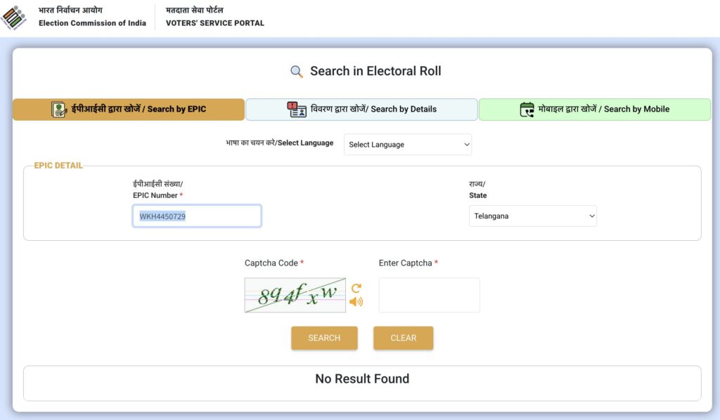 ముందుగా వైరల్ అవుతున్న ఓటర్ల జాబితాను మనం జాగ్రతగా పరిశీలిస్తే, తమన్నా, రకుల్ ప్రీత్ సింగ్ పేరిట ఒకటే ఓటర్ కార్డ్ నంబర్ (EPIC No) – WKH4450729 ఉండటం మనం గమనించవచ్చు. ఈ ఓటరు కార్డు నంబర్కు సంబంధించిన వివరాల కోసం ఎన్నికల కమిషన్ వెబ్సైట్లో వెతకగా, ఎటువంటి వివరాలు లభించలేదు.