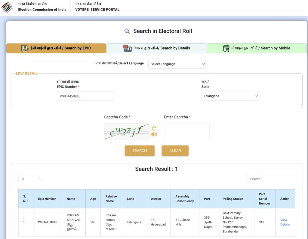 తదుపరి సినీ హీరోయిన్ సమంత పేరిట ఉన్న ఓటరు కార్డు నంబర్(EPIC No) – WKH4450946 కు సంబంధించిన వివరాల కోసం ఎన్నికల కమిషన్ వెబ్సైట్లో వెతకగా, జూబ్లీహిల్స్ నియోజకవర్గంలో ఓటరుగా నమోదైన రొక్కం శ్రీనివాస్కు చెందినదని తెలిసింది.