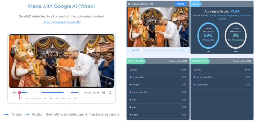 తదుపరి, ఈ వైరల్ వీడియో AI- ఉపయోగించి తయారు చేసిందా? లేదా? అని నిర్ధారించడానికి, సింథ్ ID, Hive వంటి పలు AI-జనరేటెడ్ కంటెంట్ డిటెక్టింగ్ టూల్స్ ఉపయోగించి ఈ వైరల్ వీడియోను పరిశీలించగా, రెండు AI-డిటెక్షన్ టూల్స్ ఈ వైరల్ వీడియో AI ద్వారా రూపొందించబడిందని సూచించాయి.