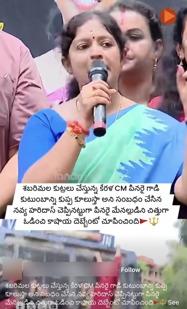 కేరళలోని 14 జిల్లాల్లో రెండు దశల్లో స్థానిక సంస్థల ఎన్నికలు జరిగాయి. కేరళ బీజేపీ మహిళా మోర్చా అధ్యక్షురాలు నవ్య హరిదాస్ కోజికోడ్ మున్సిపల్ కార్పొరేషన్ వార్డు నుండి విజయం సాధించారు (ఇక్కడ, ఇక్కడ). ఈ నేపథ్యంలో కేరళ CM పినరై కుటుంబాన్ని కుప్ప కూలుస్తా అని శపథం చేసిన నవ్య హరిదాస్ చెప్పినట్టుగా పినరయి విజయన్ మేనల్లుడిని ఓడించి చూపించింది అంటూ సోషల్ మీడియాలో (ఇక్కడ, ఇక్కడ, ఇక్కడ) షేర్ చెయ్యబడుతోంది. దీని వెనుక ఎంత నిజముందో ఈ కథనం ద్వారా తెలుసుకుందాం.