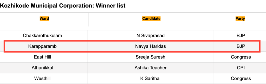 క్లెయిమ్: కేరళ స్థానిక సంస్థల ఎన్నికల్లో సీఎం పినరయి విజయన్ అల్లుడిపై బీజేపీ అభ్యర్థి నవ్య హరిదాస్ విజయం సాధించారు.