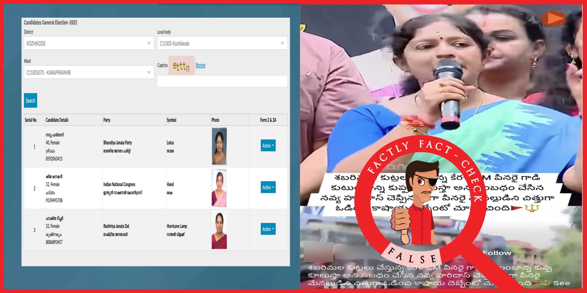 కోజికోడ్ వార్డ్ నంబర్ 70, కరప్పరంబ్ నుండి పోటీ చేసిన నవ్య హరిదాస్తో పాటు ఇతర అభ్యర్థుల వివరాల కోసం మేము పరిశోధించినప్పుడు, ఆమెతో పాటు కాంగ్రెస్ అభ్యర్ధిగా శ్రీజ కనకన్, రాష్ట్రీయ జనతా దళ్ అభ్యర్ధిగా హషితా టీచర్ పోటీ చేశారు అని స్పష్టం అయింది. నవ్య హరిదాస్ సోషల్ మీడియాలో తన ప్రత్యర్థులతో పాటు ఉన్న ఫోటోను ఎన్నికల ఫలితాల తర్వాత పోస్టు చేసారు.
