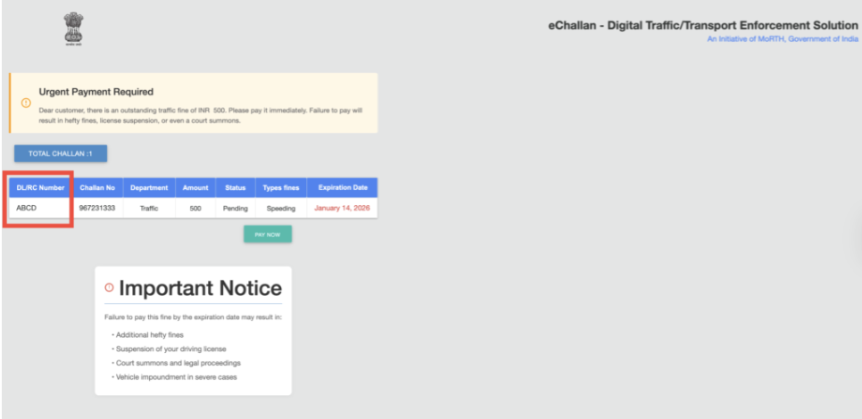 వైరల్ మెసేజ్లలో ఇచ్చే లింకులను వెరిఫై చేయటానికి వాటిపై క్లిక్ చేసి ఒక చెల్లని వాహనం యొక్క నంబర్ను ఎంటర్ చేశాము. ఇది చెల్లుబాటు అయ్యే వాహన సంఖ్య కానప్పటికీ, వేగంగా వాహనం నడపడం వాళ్ల ₹500 చలాన్ పెండింగ్లో ఉందని చూపించింది. తర్వాత, వేరు వేరు అక్షరాలు, సంఖ్యలను ఎంటర్ చేస్తు పరీక్షించగా, ప్రతిసారీ లింక్ అదే ₹500 జరిమానాను చూపించడం గమనించాం. ఇది లింక్ నిజమైనది కాదని సూచిస్తుంది. గడువు తేదీలోపు జరిమానా చెల్లించడంలో విఫలమైతే అదనపు భారీ జరిమానాలు, డ్రైవింగ్ లైసెన్స్ సస్పెన్షన్, కోర్టు సమన్లు, చట్టపరమైన చర్యలు, తీవ్రమైన కేసులలో వాహనాన్ని స్వాధీనం చేసుకునే అవకాశం ఉందని పేజీలోని ఒక వెబ్సైటులో ఒక నోటీసు పేర్కొంది.