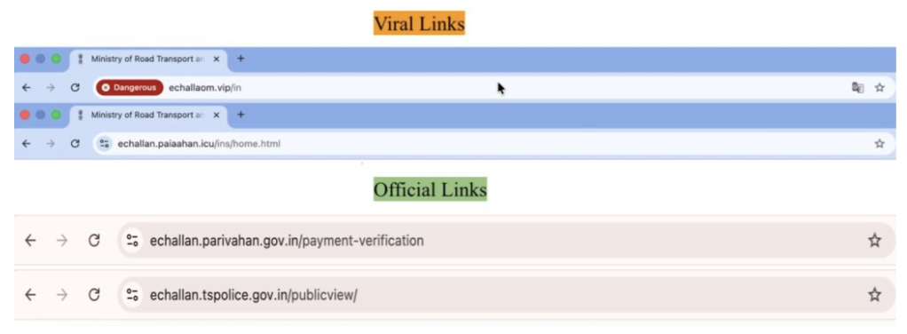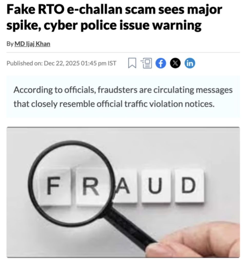 సైబర్ మోసగాళ్ళు అధికారిక ట్రాఫిక్ పోలీసు నోటిఫికేషన్లను అనుకరిస్తూ నకిలీ ఈ-చలాన్ సందేశాలతో వాహనదారులను లక్ష్యంగా చేసుకుంటున్నారని, దీనివల్ల గణనీయమైన ఆర్థిక నష్టాలు సంభవిస్తున్నాయని అనేక మీడియా కథనాలు (ఇక్కడ, ఇక్కడ, ఇక్కడ) హైలైట్ చేశాయి. ఈ నకిలీ లింక్లను క్లిక్ చేయడం వల్ల వినియోగదారులు కార్డు వివరాలు, OTPలు లేదా వ్యక్తిగత సమాచారాన్ని దొంగిలించే నకిలీ వెబ్సైట్లకు దారి తీస్తాయి. అధికారిక పరివాహన్ ఈ-చలాన్ పోర్టల్ లేదా సంబంధిత రాష్ట్ర ట్రాఫిక్ పోలీసు వెబ్సైట్ల ద్వారా మాత్రమే చలాన్ వివరాలను ధృవీకరించాలని, సందేశాల నుండి చెల్లింపు లింక్లను ఎప్పుడూ క్లిక్ చేయవద్దని అధికారులు సలహా ఇస్తున్నారు.