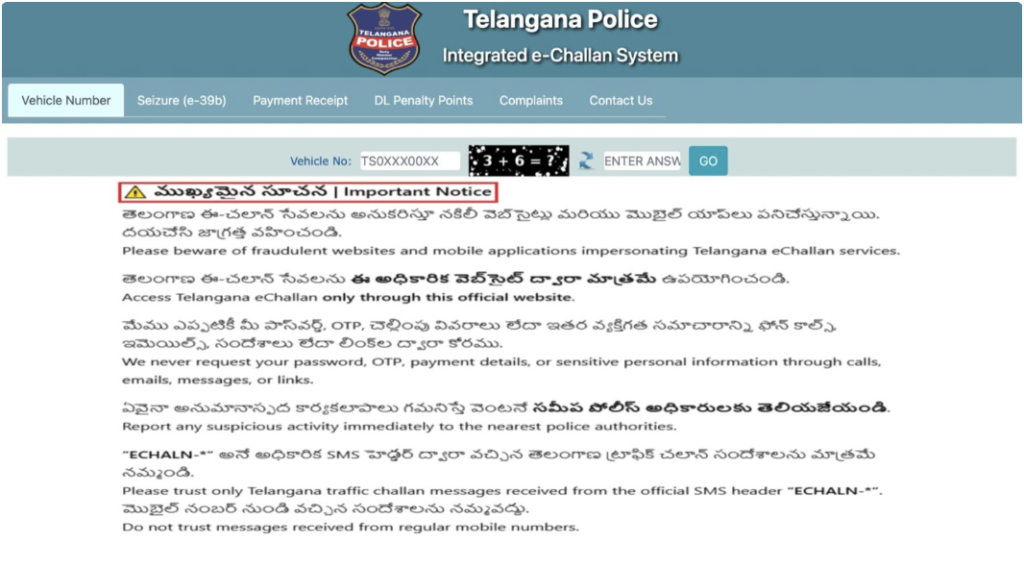 దీని గురించి మరింత వెతికితే, తెలంగాణ ప్రభుత్వ అధికారిక ఈ-చలాన్ వెబ్సైట్లో తెలంగాణ ఈ-చలాన్ సేవలను అనుకరిస్తూ మోసపూరిత వెబ్సైట్లు, మొబైల్ అప్లికేషన్లు షేర్ చెబ్బడుతున్నాయని పేర్కొంటూ ఒక నోటీసు కూడా జారీ చేయటం మేము గమనించాము. తెలంగాణ ఈ-చలాన్ సేవలను అధికారిక వెబ్సైట్ ద్వారా మాత్రమే యాక్సెస్ చేయాలని, అధికారులు ఫోన్ కాల్లు, ఇమెయిల్లు, సందేశాలు లేదా లింక్ల ద్వారా పాస్వర్డ్లు, OTPలు, చెల్లింపు వివరాలు లేదా ఇతర వ్యక్తిగత సమాచారాన్ని ఎప్పుడూ అడగరని నోటీసు స్పష్టం చేస్తుంది. ఏదైనా అనుమానాస్పద కార్యకలాపాలను వెంటనే సమీప పోలీసు అధికారులకు నివేదించాలని మరియు అధికారిక SMS హెడర్ “ECHALN-*” నుండి అందుకున్న తెలంగాణ ట్రాఫిక్ చలాన్ సందేశాలను మాత్రమే నమ్మాలని వినియోగదారులకు సూచించింది. హైదరాబాద్ పోలీసులే కాకుండా బెంగళూరు పోలీసులు, ఢిల్లీ పోలీసులు కూడా దీని గురించి పౌరులను హెచ్చరించారు.