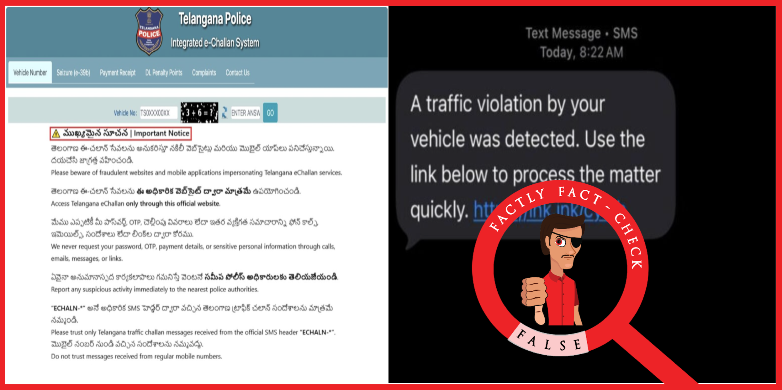 ఇటీవల వాట్సాప్ వంటి మెసేజింగ్ ప్లాట్ఫామ్లు, SMS ద్వారా పెండింగ్ ట్రాఫిక్ చలాన్ లింక్లు (ఇక్కడ, ఇక్కడ, ఇక్కడ, ఇక్కడ) షేర్ చేస్తున్నారు. ఈ మెసేజెస్ అసలైన ట్రాఫిక్ పోలీసుల అధికారిక నోటిఫికేషన్ను పోలి ఉండి, ట్రాఫిక్ జరిమానా పెండింగ్లో ఉందని పేర్కొంటూ, చెల్లింపు చేయడానికి లింక్పై క్లిక్ చేయమని అడుగుతున్నాయి. ఈ లింక్లు నిజమైనవా కాదా అని స్పష్టత కోరుతూ మా వాట్సాప్ టిప్లైన్ (+91 92470 52470) కు అనేక అభ్యర్థనలు వచ్చాయి. దీని వెనుక ఉన్న నిజానిజాలేంటో ఈ కథనం ద్వారా తెలుసుకుందాం.