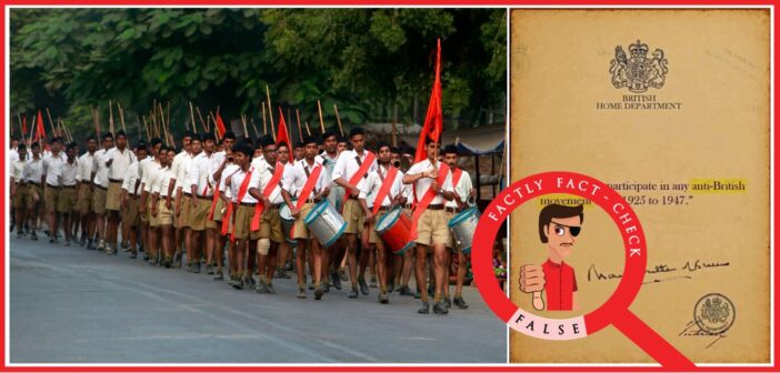 1925 నుంచి 1947 మధ్య కాలంలో రాష్ట్రీయ స్వయంసేవక్ సంఘ్ (ఆర్ఎస్ఎస్) బ్రిటిష్ వ్యతిరేక ఉద్యమంలో పాల్గొనలేదని బ్రిటిష్ హోం డిపార్ట్మెంట్ పేరుతో ఉన్న ఒక పత్రం (ఇక్కడ, ఇక్కడ & ఇక్కడ) సోషల్ మీడియాలో ప్రచారంలో ఉంది. దీంట్లో ఎంత నిజముందో ఇప్పుడు చూద్దాం.