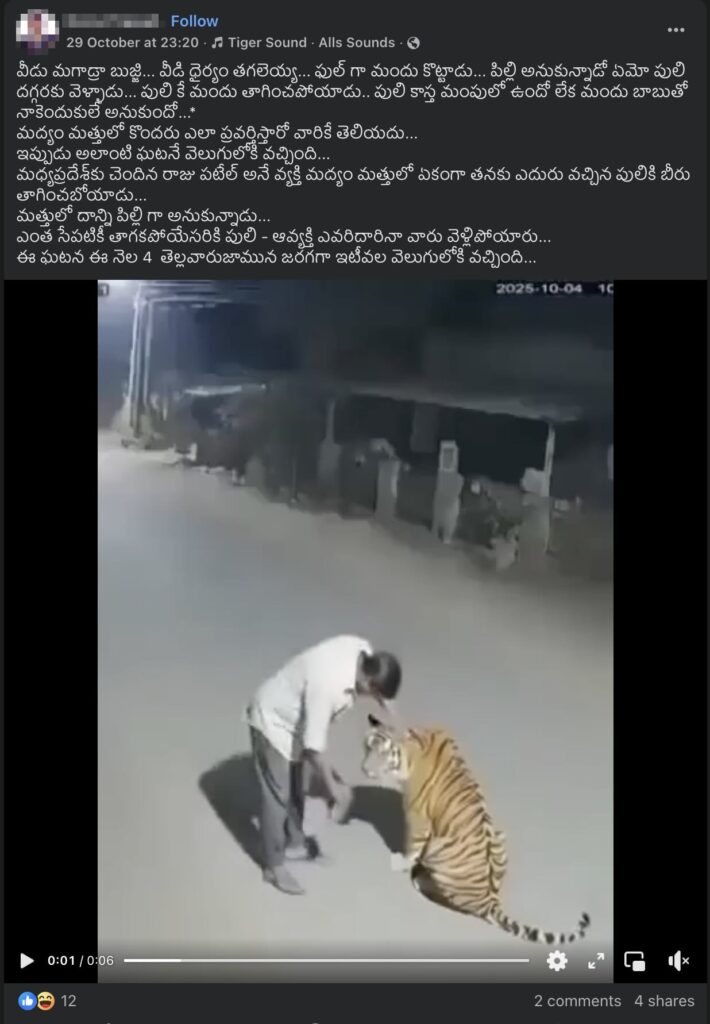 రోడ్డు మధ్యలో ఒక వ్యక్తి నిర్భయంగా ఒక పులిని పట్టుకొని, దానికి మద్యం తాగించడానికి ప్రయత్నిస్తున్నట్లు కనిపిస్తున్న వీడియో (ఇక్కడ, ఇక్కడ, ఇక్కడ) ఒకటి సోషల్ మీడియాలో వైరల్ అవుతోంది. ఈ సంఘటన మధ్యప్రదేశ్లో 5 అక్టోబర్ 2025న జరిగిందని, రాజు పటేల్గా గుర్తించబడిన ఈ వ్యక్తి మద్యం మత్తులో తనకు ఎదురుగా వచ్చిన ఒక పులికి ఈ వీడియోలో చూపిస్తున్నట్లు బీరు తాగించబోయాడని చెప్తూ ఈ వీడియోని సోషల్ మీడియా యూజర్లు షేర్ చేస్తున్నారు. ఈ క్లెయిమ్ వెనుక ఎంత నిజం ఉందో ఈ ఆర్టికల్ ద్వారా చూద్దాం.
