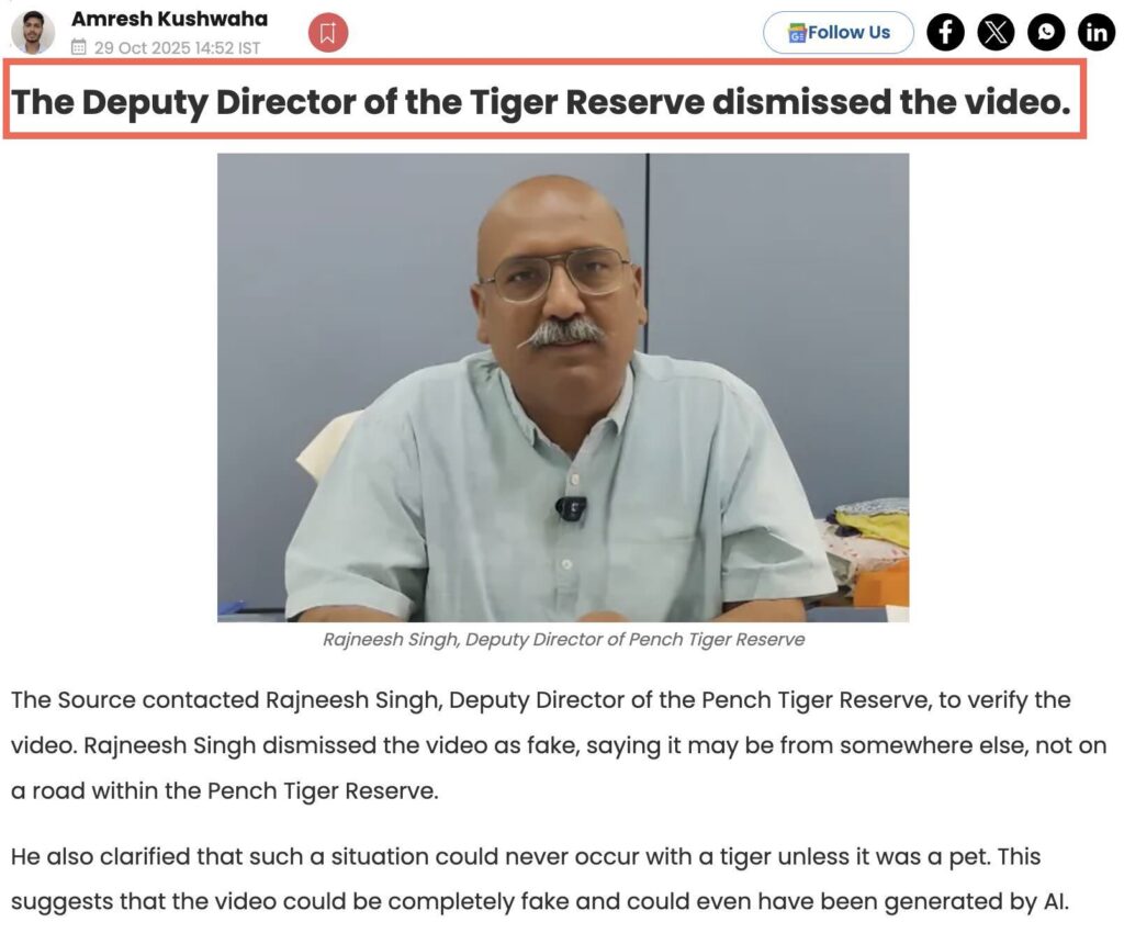 మరింత ధృవీకరణ కోసం, మేము మధ్యప్రదేశ్లోని పెంచ్ టైగర్ రిజర్వ్ యొక్క డిప్యూటీ డైరెక్టర్ రజనీష్ కుమార్ సింగ్ను సంప్రదించాము. ఆయన ఈ వీడియో నకిలీదని ధృవీకరించారు. అలాగే ఇటీవల పులికి సంబంధించిన అటువంటి సంఘటన ఏదీ జరగలేదని స్పష్టం చేశాడు.