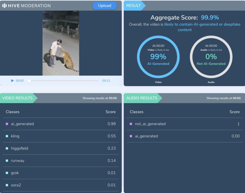 అదనంగా, మేము వైరల్ పోస్ట్లను పరిశీలించగా, ఈ వీడియో AI-ఉపయోగించి తయారు చేసినదని కొందరు యూజర్లు కామెంట్ చేయడం గమనించాము. ఈ విషయాన్ని వెరిఫై చేయడానికి, మేము హైవ్ అనే AI కంటెంట్ డిటెక్షన్ టూల్ ఉపయోగించి ఈ వీడియోను విశ్లేషించాము. ఇది AI-జనరేటెడ్ వీడియో అని హైవ్ యొక్క విశ్లేషణలో మాకు తెలిసింది. దీనిబట్టి వైరల్ అవుతున్న వీడియో నిజమైనది కాదని మనకు స్పష్టం అవుతుంది.