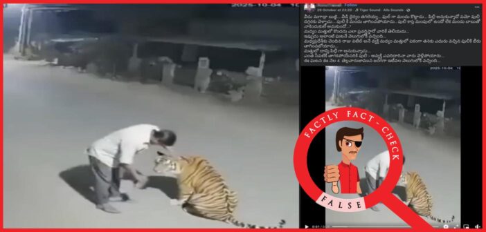 రోడ్డు మధ్యలో ఒక వ్యక్తి నిర్భయంగా ఒక పులిని పట్టుకొని, దానికి మద్యం తాగించడానికి ప్రయత్నిస్తున్నట్లు కనిపిస్తున్న వీడియో (ఇక్కడ, ఇక్కడ, ఇక్కడ) ఒకటి సోషల్ మీడియాలో వైరల్ అవుతోంది. ఈ సంఘటన మధ్యప్రదేశ్లో 5 అక్టోబర్ 2025న జరిగిందని, రాజు పటేల్గా గుర్తించబడిన ఈ వ్యక్తి మద్యం మత్తులో తనకు ఎదురుగా వచ్చిన ఒక పులికి ఈ వీడియోలో చూపిస్తున్నట్లు బీరు తాగించబోయాడని చెప్తూ ఈ వీడియోని సోషల్ మీడియా యూజర్లు షేర్ చేస్తున్నారు. ఈ క్లెయిమ్ వెనుక ఎంత నిజం ఉందో ఈ ఆర్టికల్ ద్వారా చూద్దాం.
