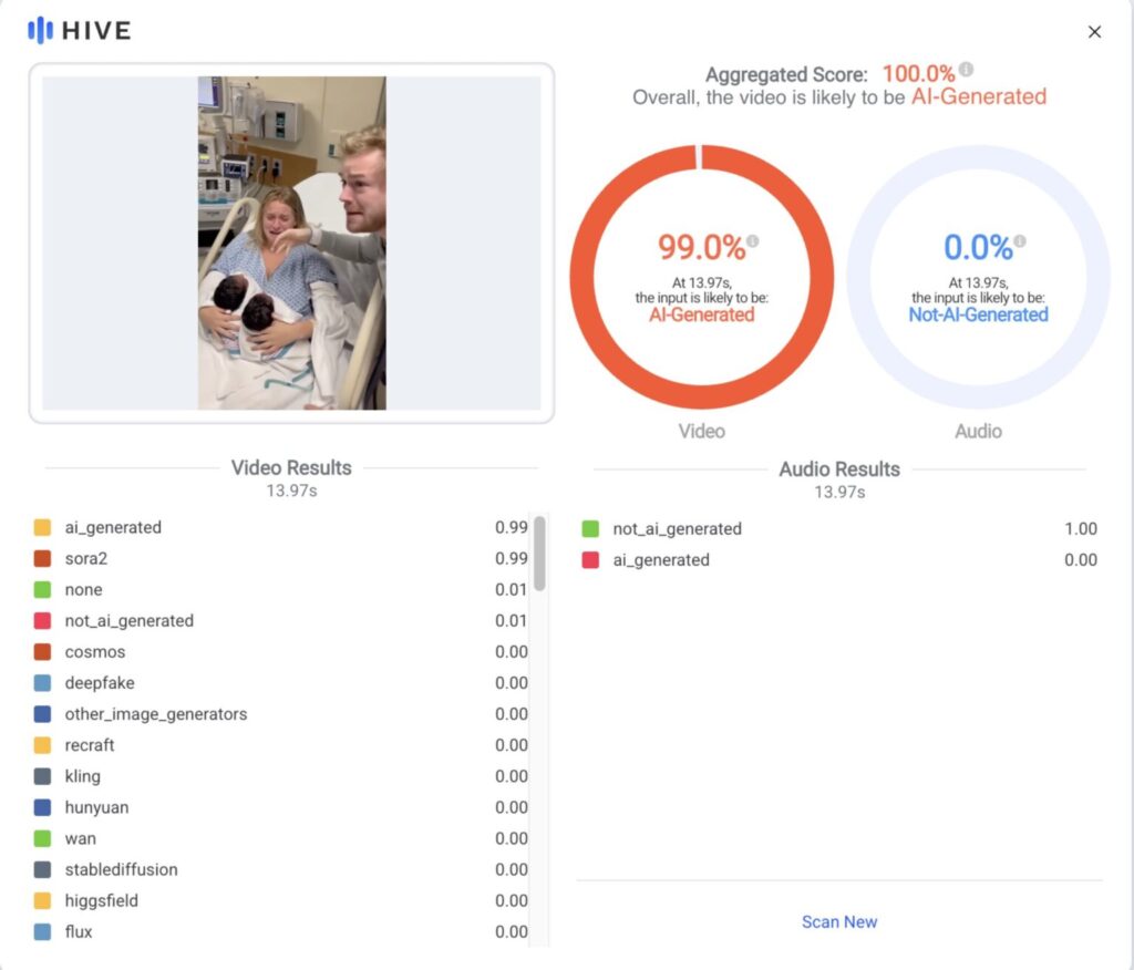 తదుపరి ఈ వైరల్ వీడియో AI- ఉపయోగించి తయారు చేసిందా? లేదా? అని నిర్ధారించడానికి, Hive వంటి పలు AI-జనరేటెడ్ కంటెంట్ డిటెక్టింగ్ టూల్స్ ఉపయోగించి ఈ వైరల్ వీడియోను పరిశీలించగా, ఈ వీడియో 100% AI- జనరేటెడ్ కావచ్చని Hive ఫలితాన్ని ఇచ్చింది. దీన్ని బట్టి ఈ వైరల్ వీడియో AI ద్వారా రూపొందించబడిందని మనం నిర్ధారించవచ్చు.