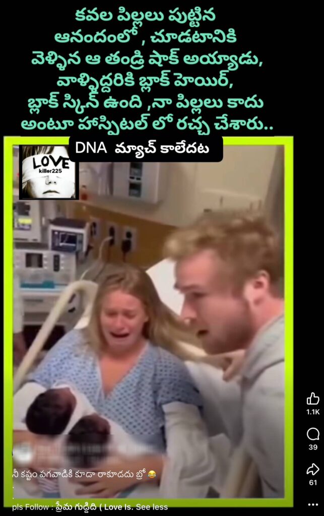 చివరిగా, ఒక తెల్ల జంటకు నల్లరంగు కవలలు జన్మించగా భర్త భార్యను అనుమానించాడు అంటూ AI ద్వారా తయారు చేసిన వీడియోను తప్పుగా షేర్ చేస్తున్నారు.