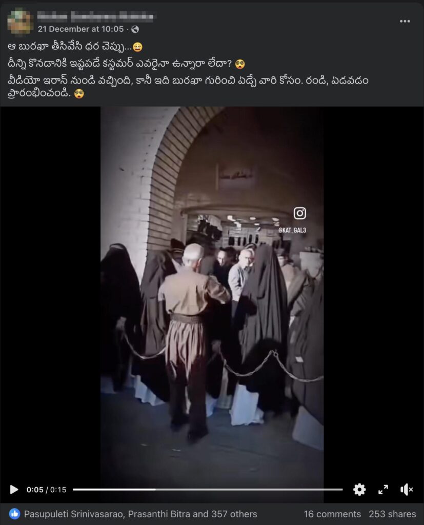ఒక రోడ్డు పక్కన కొందరు బుర్ఖా ధరించిన మహిళల నఖాబ్ను (ముసుగును) ఒక వ్యక్తి తీసి చూస్తున్న వీడియో (ఇక్కడ, ఇక్కడ) ఒకటి సోషల్ మీడియాలో షేర్ చేయబడుతోంది. ఆ మహిళలందిరి చేతులకు గొలుసులు వేసి ఉండటం మనం ఈ వీడియోలో చూడవచ్చు. ‘ఆ బురఖా తీసివేసి ధర చెప్పు…😩 దీన్ని కొనడానికి ఇష్టపడే కస్టమర్ ఎవరైనా ఉన్నారా లేదా? 😵💫 ..’ అని ఉన్న ఈ పోస్టు యొక్క వివరణ, మహిళలను కొనుక్కునే (కొనుగోలు చేసే) ఒక మార్కెట్ లాంటి ప్రదేశంలో ఈ వీడియోను చిత్రించారని సూచిస్తుంది. ఈ వీడియో ఇరాన్ దేశంలో తీసిందని, ఈ పోస్టు వివరణలో ఉంది. అసలు, ఈ క్లెయిమ్ వెనుక ఎంత నిజం ఉందో ఈ ఆర్టికల్ ద్వారా చూద్దాం.