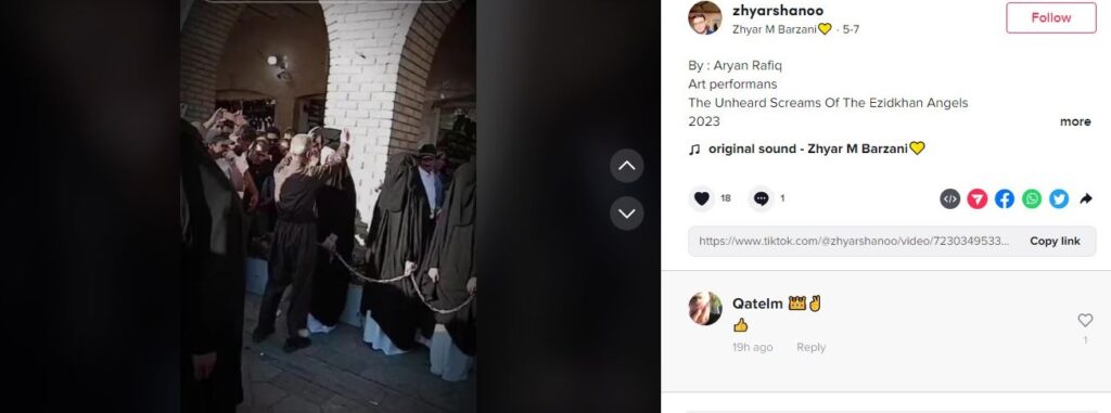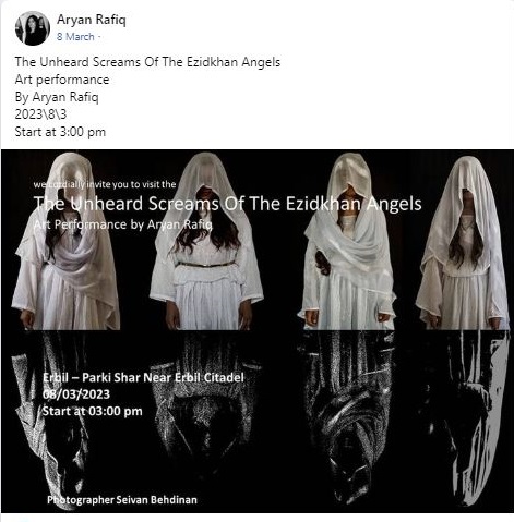 ఈ సమాచారాన్ని క్లూగా తీసుకొని, తగిన కీవర్డ్స్ ఉపయోగించి ఇంటర్నెట్లో వెతకగా, ఆర్యన్ రఫీక్ యొక్క ఫేస్బుక్ పేజీ మాకు కనిపించింది. అందులో “The Unheard Screams Of The Ezidkhan Angels” కళా ప్రదర్శన (art performance/drama) గురించి ఆమె చేసిన ఒక పోస్ట్ కనిపించింది. ఆర్యన్ రఫీక్ ఒక కుర్దిష్ కళాకారిణి. ఆమె 8 మార్చి 2023న చేసిన ఈ ఫేస్బుక్ పోస్ట్లో, తన “The Unheard Screams Of The Ezidkhan Angels” నాటకం యొక్క ప్రదర్శన ఇరాక్లో ఉన్న ఎర్బిల్ సిటాడెల్ సమీపంలోని ఎర్బిల్-పార్కి షార్ అనే ప్రదేశంలో జరగనుందని చెప్తూ, దీన్ని చూడడానికి ప్రజలకు ఆహ్వానం పలికారు.