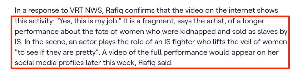 ఈ వీడియో గురించి VRT న్యూస్తో ఆర్యన్ రఫీక్ మాట్లాడుతూ, ఈ వీడియో తను చేసిన ఒక కళా ప్రదర్శన (art performance/drama) అని ధృవీకరించారు. ఐసిస్ (ISIS) చేత కిడ్నాప్ చేయబడి, బానిసలుగా అమ్ముడుపోయిన మహిళల దుస్థితి గురించి చేసిన ఒక పెద్ద ప్రదర్శనకు సంబంధించిన ఒక చిన్న భాగమే ఈ వీడియో అని ఆర్యన్ రఫీక్ వారితో అన్నారు.