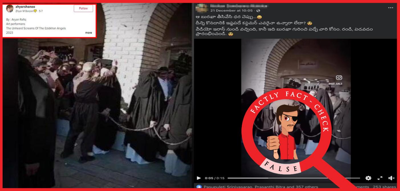 ఫ్యాక్ట్(నిజం): ఈ వీడియో ఆర్యన్ రఫీక్ అనే కుర్దిష్ కళాకారిణి డైరెక్ట్ చేసిన ఒక ఆర్ట్ ప్రదర్శనను (drama) చూపిస్తుంది, ఇరాన్లో స్త్రీలను అమ్ముతున్న నిజమైన మార్కెట్ను కాదు. ఐసిస్ (ISIS) చేత కిడ్నాప్ చేయబడి, బానిసలుగా అమ్మబడిన మహిళల దుస్థితిని ఈ వీధి నాటకం చూపిస్తుంది. కావున, ఈ పోస్టులో చేస్తున్న క్లెయిమ్ తప్పు.
