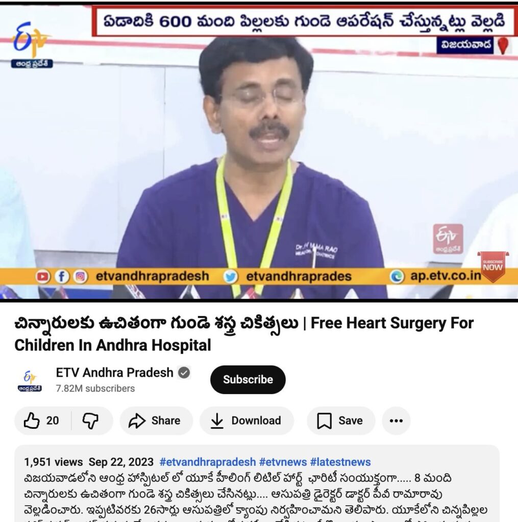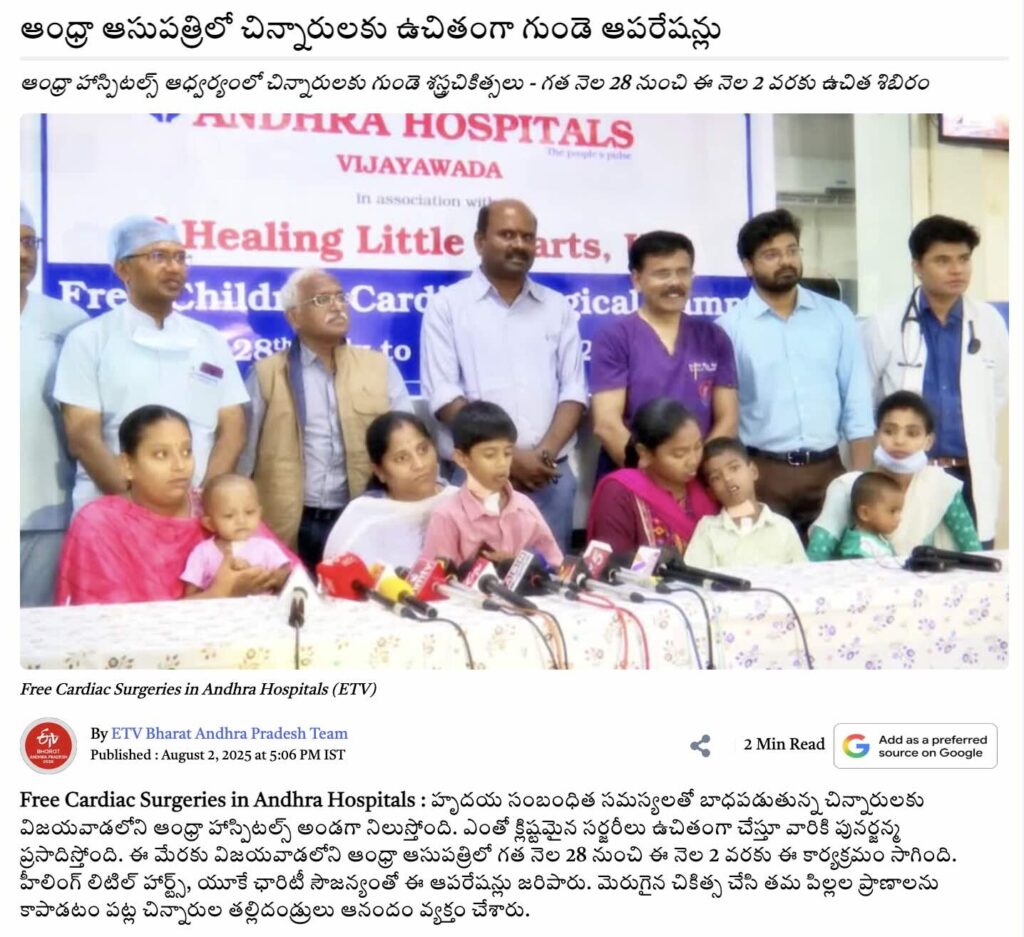 02 ఆగస్టు 2025న ప్రచురితమైన ‘ETV భారత్’ వార్తా కథనం ప్రకారం, UK స్వచ్ఛంద సంస్థ అయిన హీలింగ్ లిటిల్ హార్ట్స్ సౌజన్యంతో విజయవాడలోని ఆంధ్రా హాస్పిటల్లో 28 జూలై 2025 నుండి 02 ఆగస్టు 2025 వరకు గుండె సంబంధిత సమస్యలతో బాధపడుతున్న పిల్లలకు ఉచిత గుండె శస్త్రచికిత్సలు జరిగాయి.