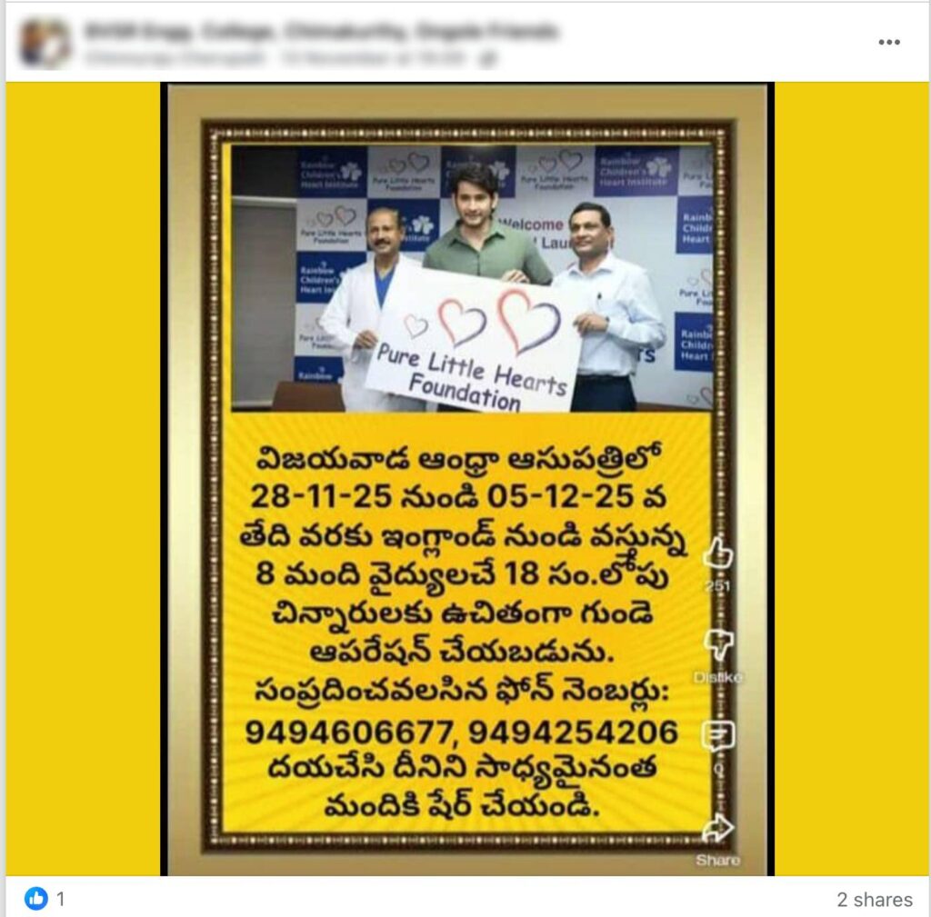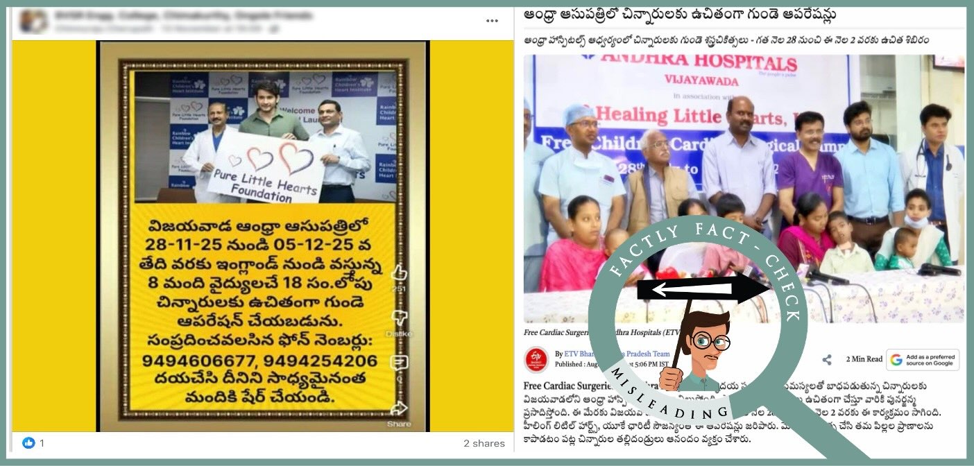 ఫాక్ట్(నిజం): లండన్కు చెందిన హీలింగ్ లిటిల్ హార్ట్స్ (HLH), సినీహీరో మహేష్ బాబుకు చెందిన స్వచ్ఛంద సంస్థ వంటి పలు సంస్థల సహకారంతో ఆంధ్ర హాస్పిటల్స్ వారు చిన్న పిల్లలకు ఉచిత గుండె ఆపరేషన్లు చేస్తున్నా, పోస్టులో ప్రచారం చేసినట్టు 28 నవంబర్ 2025 నుండి 05 డిసెంబర్ 2025 తేదీ వరుకు చిన్నారులకు ఉచితంగా గుండె ఆపరేషన్లు చేయటం లేదు. విజయవాడ ఆంధ్ర హాస్పిటల్స్ వర్గాలు ఈ విషయాన్ని మాకు (Factly) స్పష్టం చేశాయి. కావున పోస్టు ద్వారా చెప్పేది తప్పుదోవ పట్టించే విధంగా ఉంది.