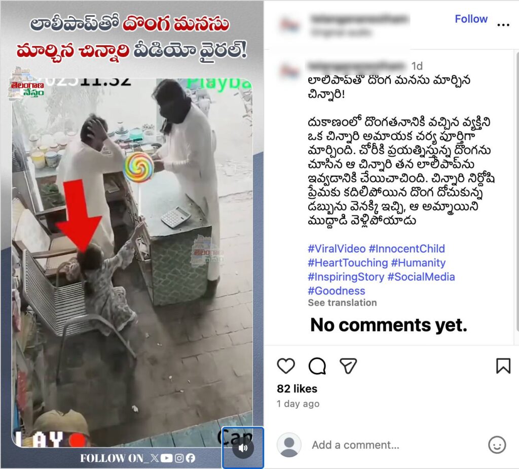 “లాలీపాప్తో దొంగ మనసు మార్చిన చిన్నారి! దుకాణంలో దొంగతనానికి వచ్చిన వ్యక్తిని ఒక చిన్నారి అమాయక చర్య పూర్తిగా మార్చింది. చోరీకి ప్రయత్నిస్తున్న దొంగను చూసిన ఆ చిన్నారి తన లాలీపాప్ను ఇవ్వడానికి చేయిచాచింది. చిన్నారి నిర్దోషి ప్రేమకు కదిలిపోయిన దొంగ దోచుకున్న డబ్బును వెనక్కి ఇచ్చి, ఆ అమ్మాయిని ముద్దాడి వెళ్లిపోయాడు” అంటూ ఓ వీడియో సోషల్ మీడియాలో వైరల్ అవుతోంది (ఇక్కడ, ఇక్కడ, ఇక్కడ, ఇక్కడ, & ఇక్కడ) ఈ వైరల్ వీడియో ఒక నిజమైన సంఘటనను చూపిస్తున్నట్లు సోషల్ మీడియాలో షేర్ చేస్తున్నారు. పలు తెలుగు మీడియా సంస్థలు కూడా ఇది నిజమైన ఘటనగా రిపోర్ట్ చేశాయి (ఇక్కడ, ఇక్కడ, & ఇక్కడ). ఈ కథనం ద్వారా అందులో ఎంత నిజముందో చూద్దాం.