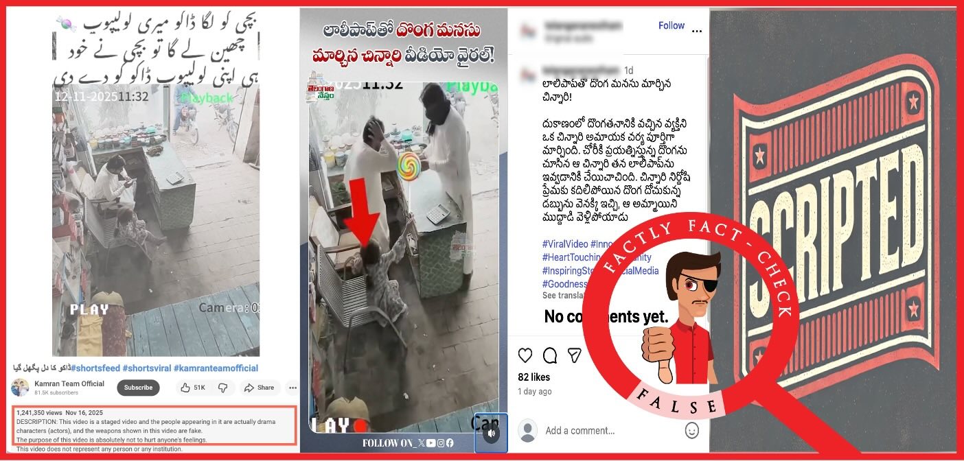 చివరగా, లాలీపాప్తో దొంగ మనసు మార్చిన చిన్నారి అంటూ వైరల్ అవుతున్న ఈ వీడియో నిజమైన ఘటనను చూపించడం లేదు, ఇదొక స్క్రిప్టెడ్ వీడియో.