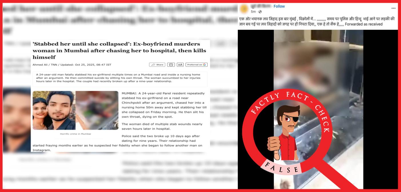 Fact: The video actually shows a 24 October 2025 incident from the Kalachowkie area of central Mumbai, where a man named Sonu Barai fatally stabbed his ex-girlfriend Manisha Yadav before slitting his own throat and dying on the spot. Manisha sustained multiple injuries and died during treatment at a hospital in Byculla. The attack stemmed from personal relationship issues. The Kalachowkie Police confirmed to Factly that both the victim and the accused belong to the Hindu community, and there is no communal or ‘love jihad’ angle to the case. Hence, the claim made in the post is FALSE.