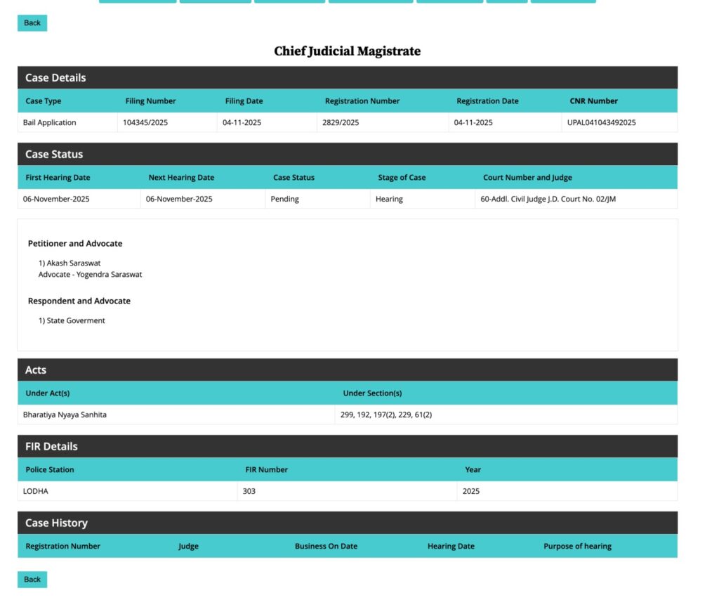 To check if any communal angle was involved, Factly contacted the Lodha Police Station. Police officer Vinod confirmed that the case has been registered as FIR No. 303/2025. He also stated that all the accused are Hindu men and mentioned the same names reported by the media. However, due to the sensitivity of the matter and the ongoing investigation, the FIR is currently unavailable on the Uttar Pradesh Police website. We then checked the Aligarh court website for additional details and found that one of the accused, Akash Saraswat, had filed a bail petition on 04 November 2025, which is scheduled to be heard on 06 November 2025.