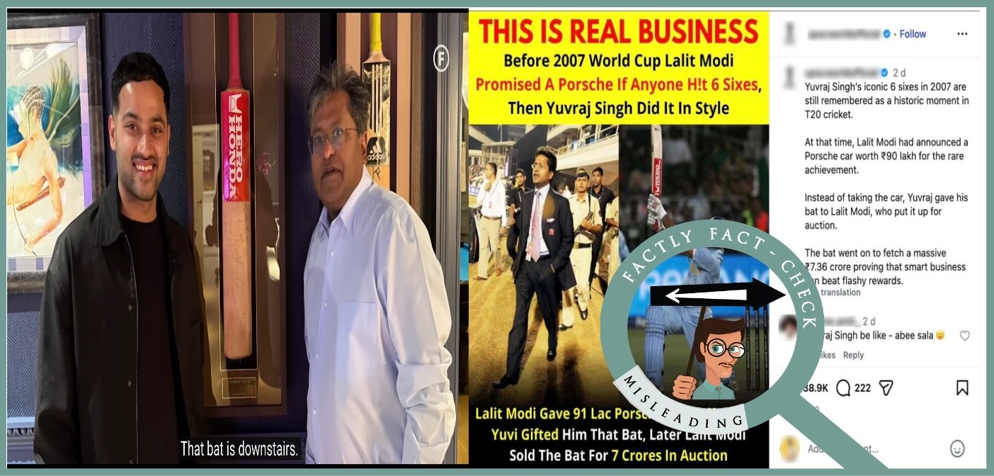 Fact: Lalit Modi did gift a Porsche car to Yuvraj Singh for hitting six sixes in an over during the 2007 T20 World Cup. He later collected the bat from Yuvraj Singh, and the bat is still in his possession; it was not auctioned. Lalit Modi has stated in a couple of recent podcasts that the bat is kept at his home, and in one of these podcasts, the bat was shown at his residence. There are no credible reports indicating that he auctioned the bat. Hence, the claim is MISLEADING.