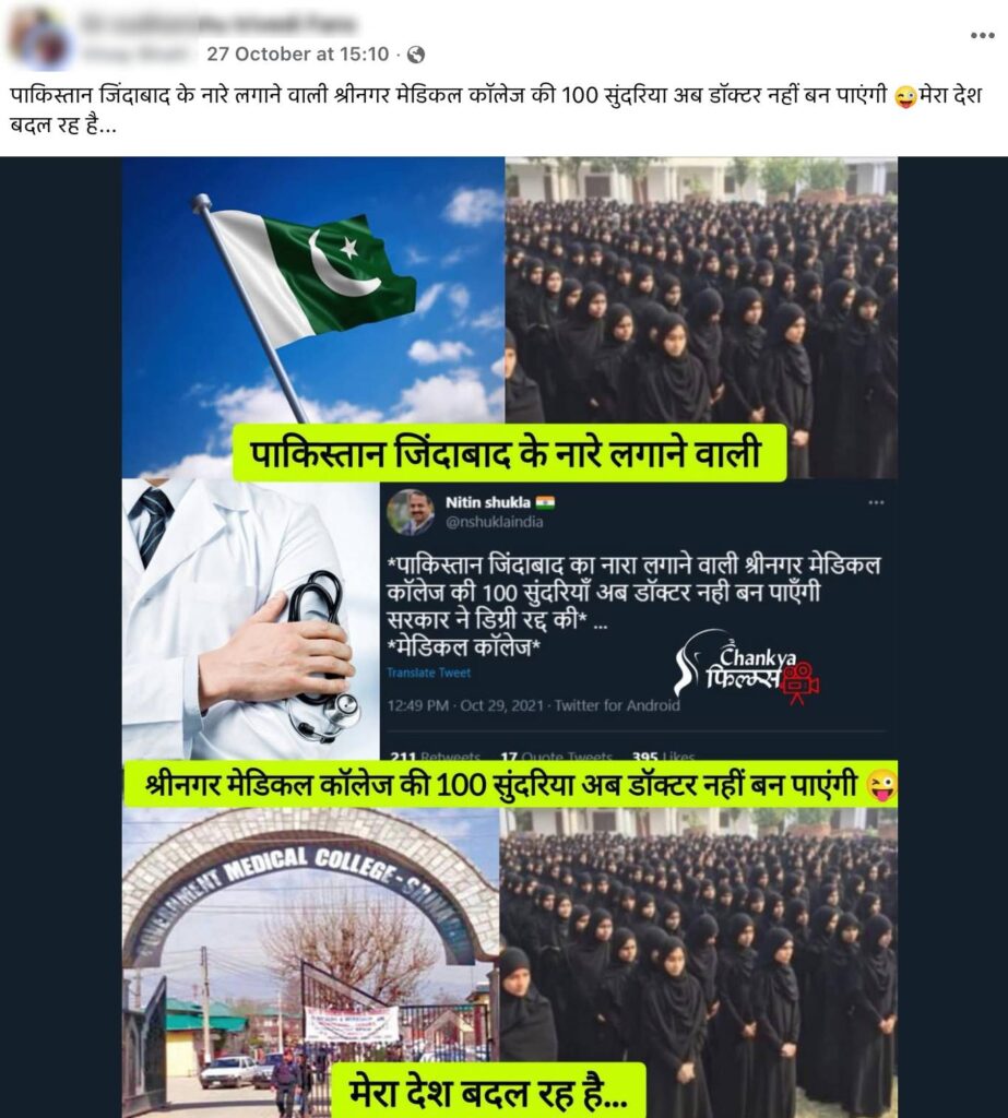 A post circulating widely on social media (here, here, and here) claims that 100 students who raised the slogan ‘Pakistan Zindabad’ at Srinagar Medical College in Jammu & Kashmir will no longer be able to become doctors, as the government has cancelled their degrees. The post also features a photo showing several girls wearing burqas standing in formation. Let’s verify the claim made in the post in this article.