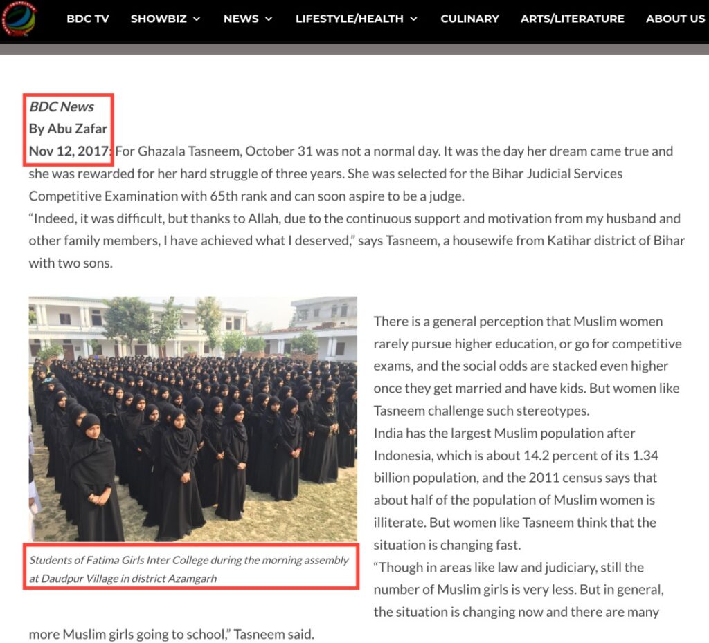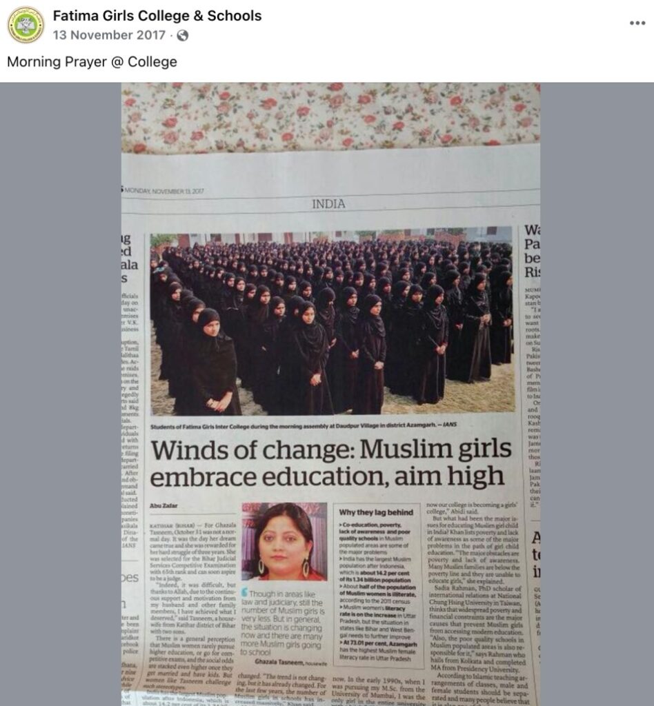 We also found that in November 2017, Fatima Girls College & Schools shared a newspaper clipping on their Facebook page carrying the same photo, stating that it was taken during the morning prayer at the college.