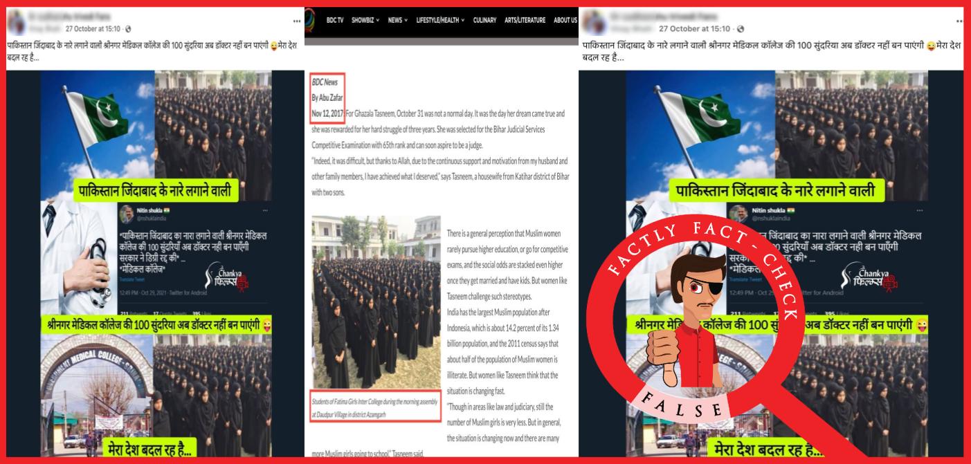 A post circulating widely on social media (here, here, and here) claims that 100 students who raised the slogan ‘Pakistan Zindabad’ at Srinagar Medical College in Jammu & Kashmir will no longer be able to become doctors, as the government has cancelled their degrees. The post also features a photo showing several girls wearing burqas standing in formation. Let’s verify the claim made in the post in this article.