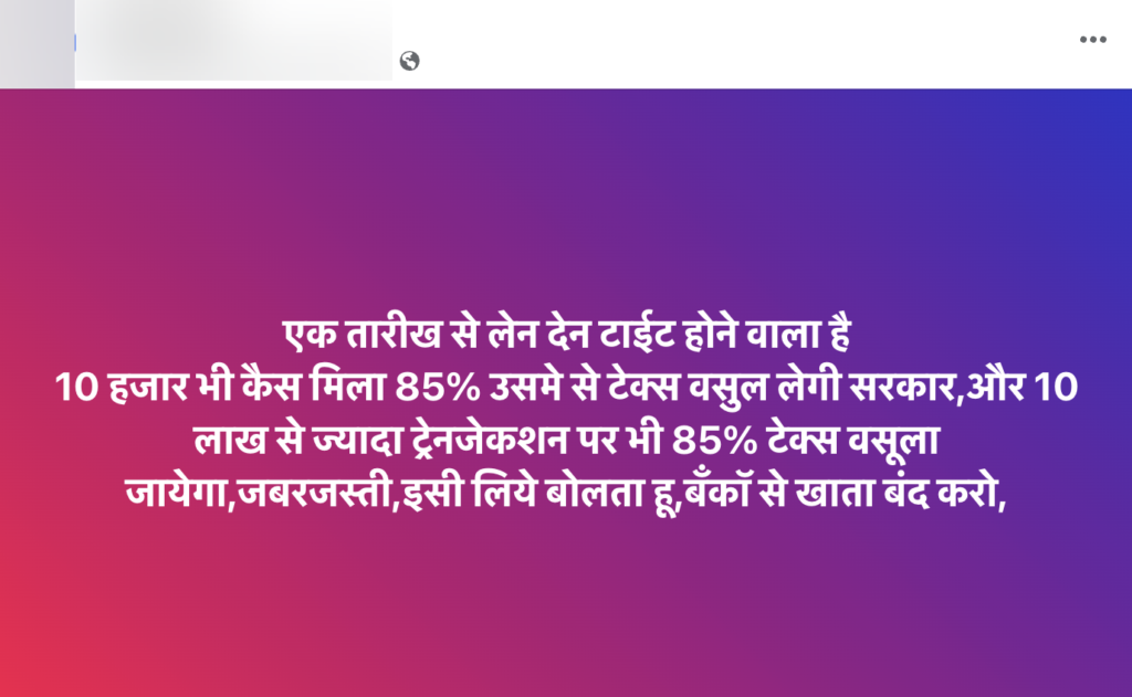 A post claiming that the Indian government will impose an 85% tax on transactions over ₹10 lakhs is being circulated on social media. Let’s verify the claim made in the post.