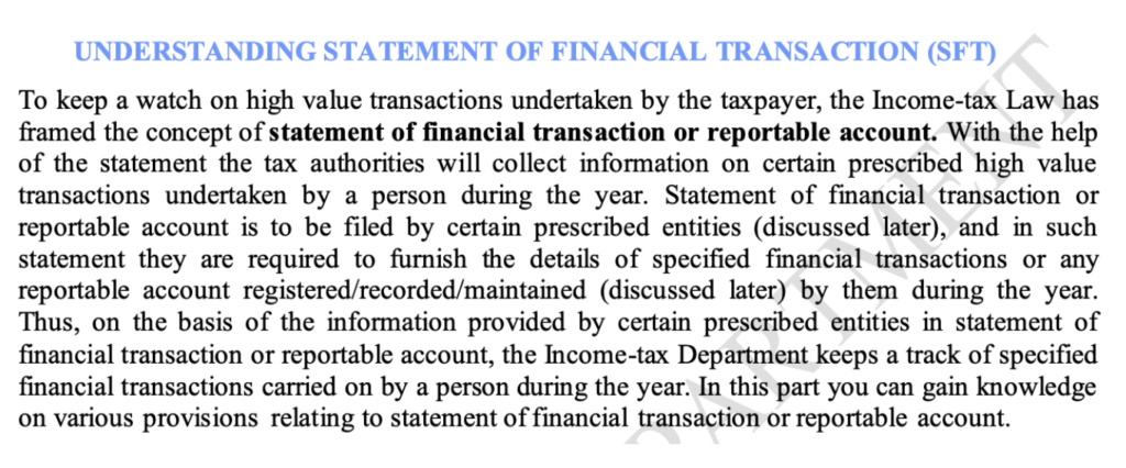 Under Section 285BA of the Income-tax Act 1961, banks and financial institutions are required to report certain high-value transactions, such as high-value cash deposits in a financial year, large credit card payments, big mutual fund investments, and high-value property deals, to the Income Tax Department through a Statement of Financial Transactions (SFT). These reports are for monitoring purposes and help the tax authorities check whether these transactions are in line with the income declared by a person. No tax is automatically charged on such transactions.