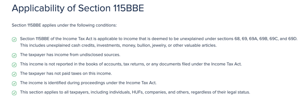However, under Section 115BBE, if the Income Tax Department finds money or income for which a person cannot give a valid explanation or source, it is taxed at a very high rate if it remains as unexplained income. This applies only to cases such as unaccounted cash or credits with no proper source. The main purpose of introducing this provision was to curb black money and tax evasion.
