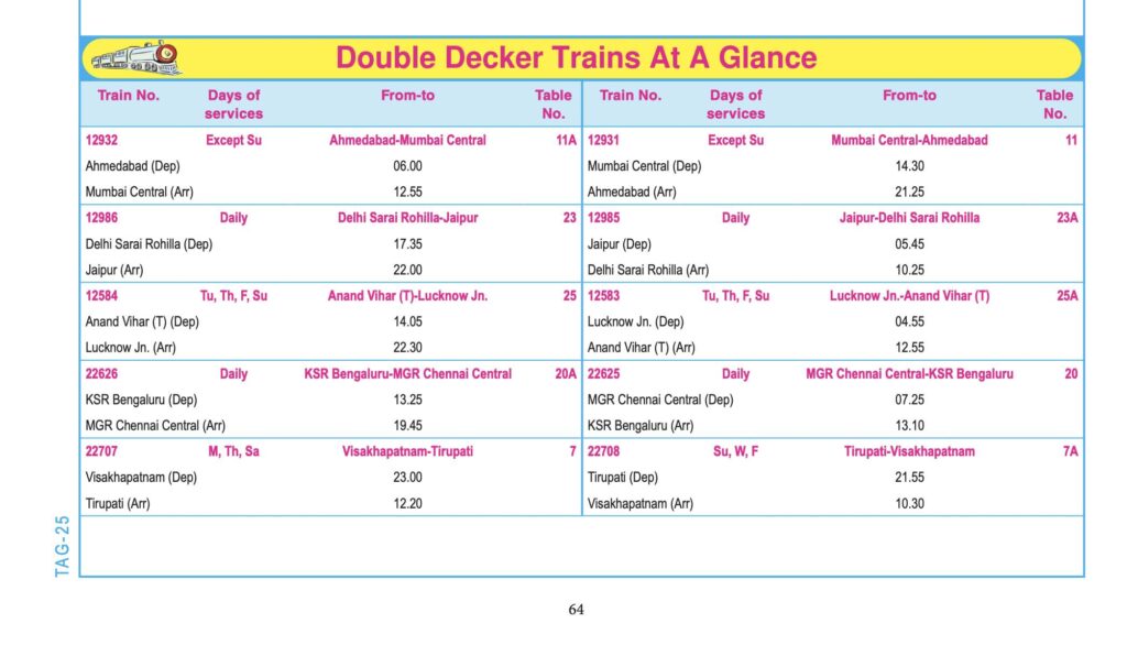 As of October 2025 (here, here), Indian Railways operates Double Decker AC trains on seven routes: Ahmedabad–Mumbai Central, Visakhapatnam–Tirupati, Delhi Sarai Rohilla–Jaipur, Anand Vihar Terminal–Lucknow Junction, KSR Bengaluru–MGR Chennai Central, Visakhapatnam–Guntur, and Coimbatore–Bengaluru, with the latter two operated under the brand name Uday trains.