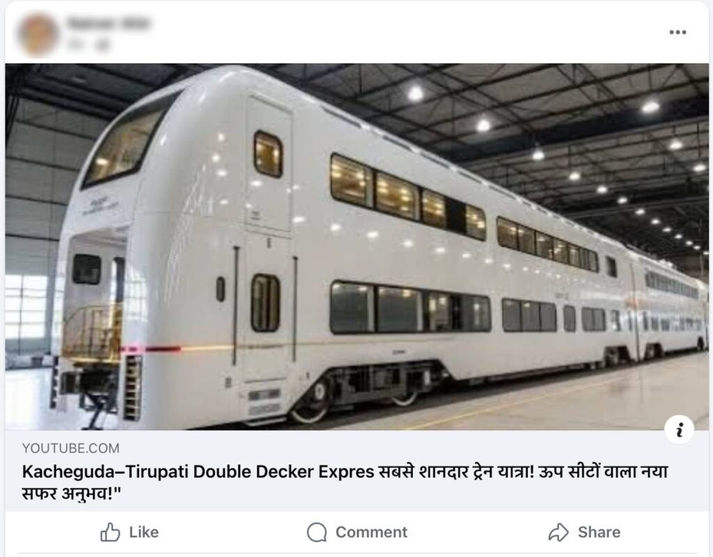 A video claiming to show the Kacheguda–Tirupati–Kacheguda AC Double Decker Express (Train No. 22120/22119) is going viral on social media (here, here, and here). The video further discusses the features and facilities available on the train. Through this article, let us fact-check the claim made in the post.