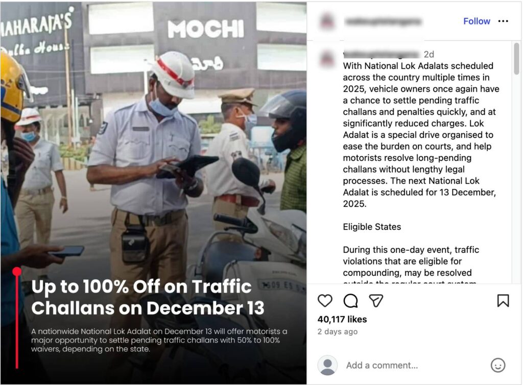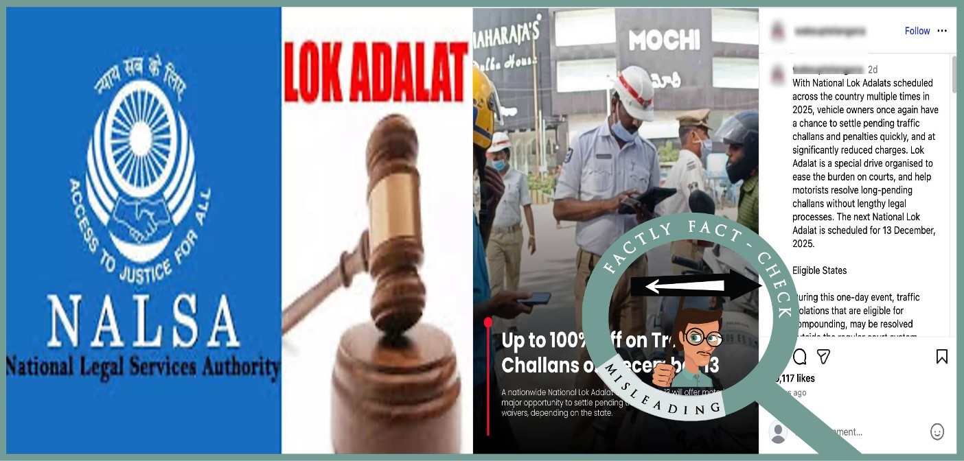 Several posts (here, here) on social media are going viral, claiming that a nationwide National Lok Adalat on 13 December 2025 will offer motorists a major opportunity to settle pending traffic challans with waivers ranging from 50% to 100%, depending on the state. The states said to be included are Delhi, Haryana, Punjab, Maharashtra, Uttar Pradesh, Gujarat, Tamil Nadu, Telangana, Karnataka, Rajasthan and West Bengal. Multiple well-known news websites and media houses have also reported the same (here, here). Through this article, let us fact-check the claim made in these posts.