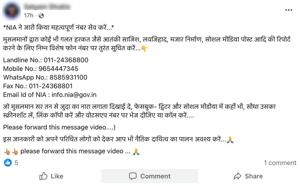 A viral social media post (here, here) claims that the National Investigation Agency (NIA) has circulated specific phone numbers for reporting suspicious activities by Muslims. The post alleges that these activities include “terrorist plots,” “love jihad,” “shrine construction,” and certain social media posts. It further claims that if a Muslim individual is seen chanting “sar tan se juda” online, users should take a screenshot and send it to the provided WhatsApp number to alert the NIA. Let’s verify the claim made in the post in this article.