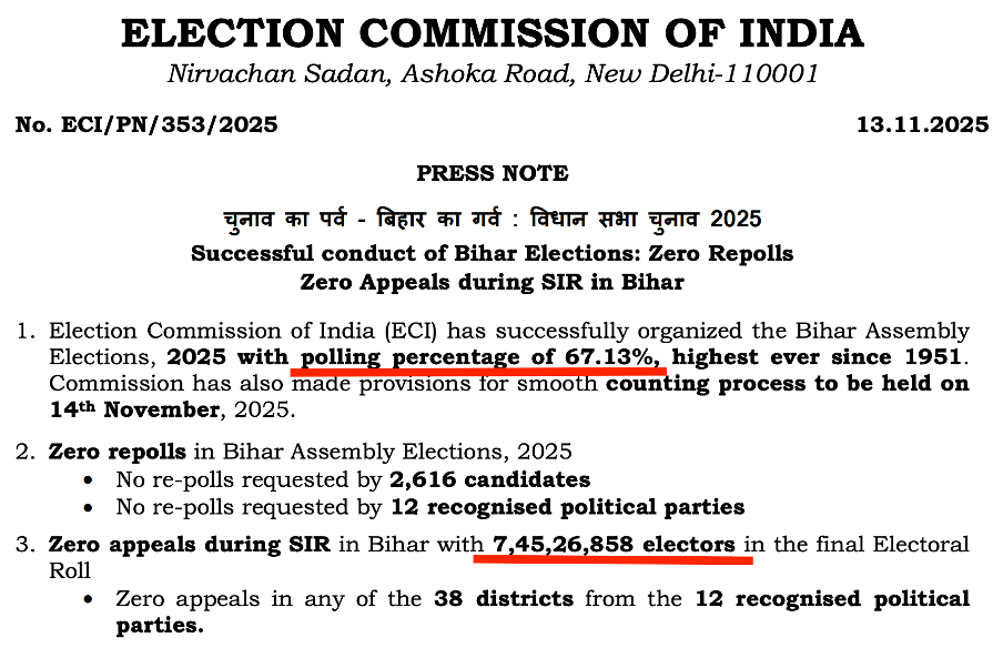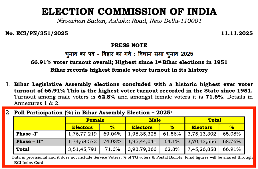According to the Election Commission’s press note issued on 13 November 2025, the updated voter turnout is 67.13%. This means that out of 7.45 crore registered voters, only about five crore actually cast their votes. Here, it’s essential to note that the term “electors” in the press note refers to individuals who are eligible to vote, not those who have already cast their votes.