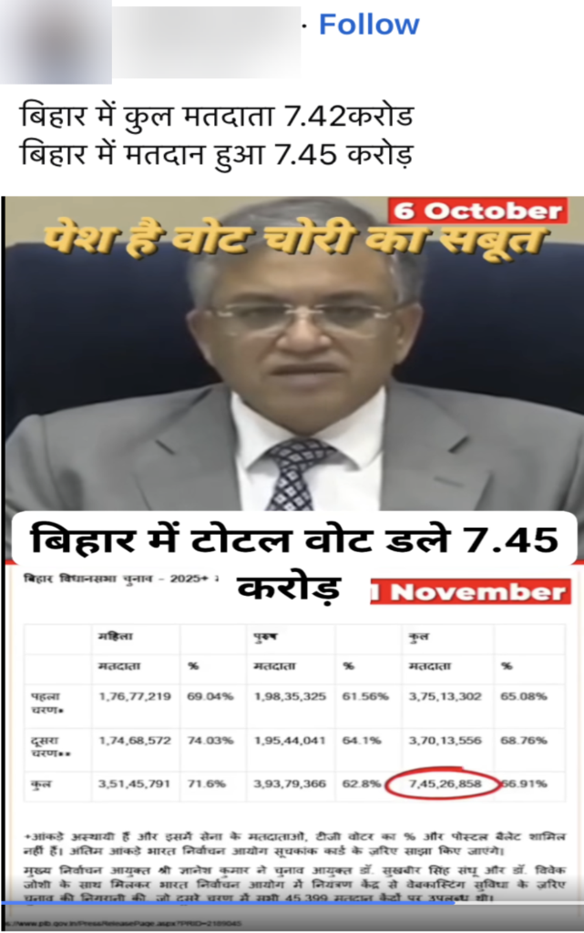 In this context, a widely circulated social media post (here, here, here & here) claims that the voter turnout exceeded 100%, alleging that 7.45 crore votes were cast despite there being only 7.42 crore registered voters for the 2025 Bihar Assembly elections. Let’s verify the claim made in the post.