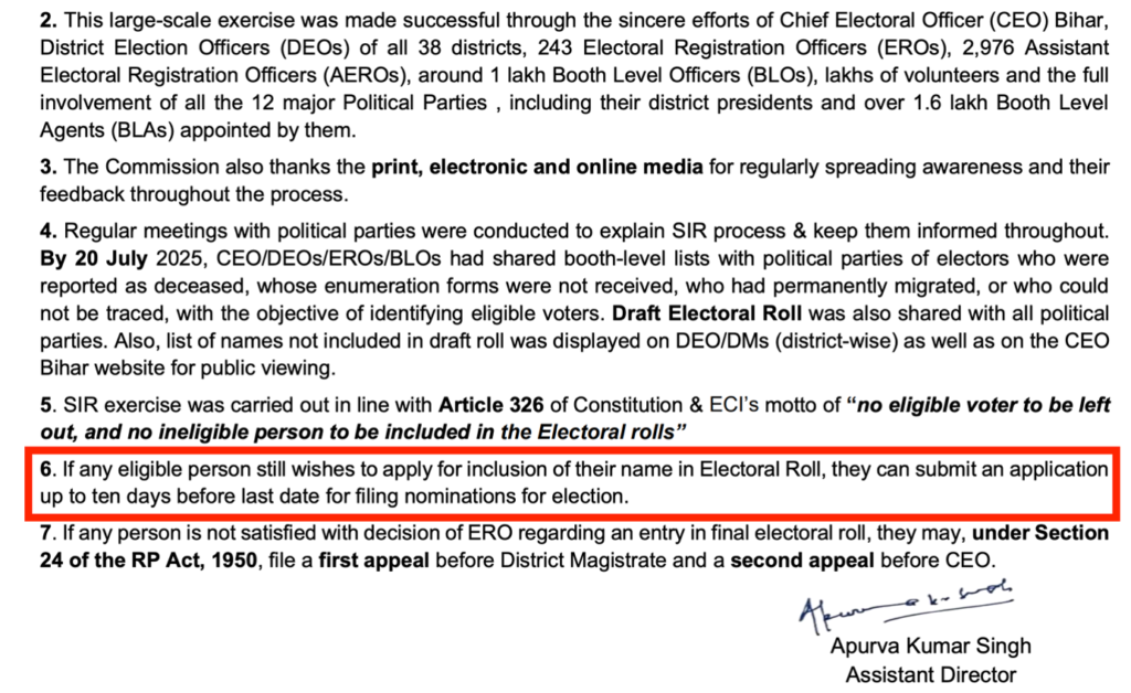 However, the Chief Election Commissioner Gyanesh Kumar, during a press conference on 5 October 2025, announced that individuals whose names were missing from the voter list could still apply for inclusion up to ten days before the final deadline, i.e, between 10 October and 20 October 2025.