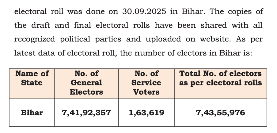 Similarly, the election schedule released by the Election Commission on 6 October 2025 mentioned that the number of registered voters at that time was 7,43,55,976.